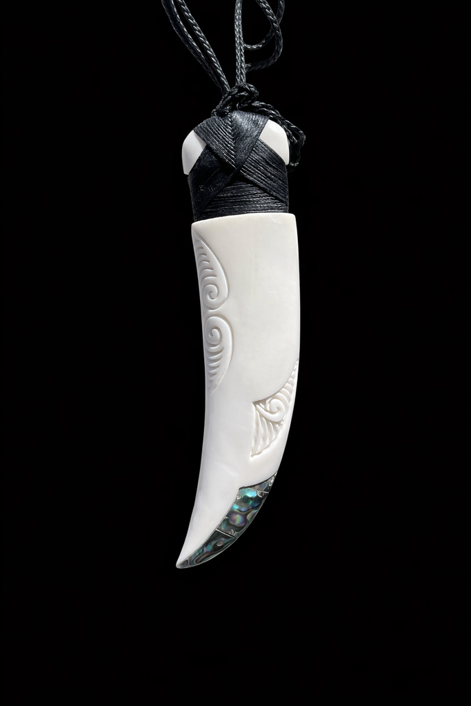 Beef bone etched tooth with paua inlay